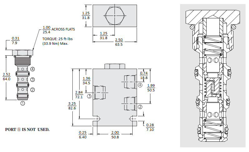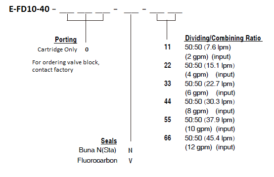In the dividing mode, the E-FD10-40 will divert input flow from port 3 to ports 2 and 4, based on the ratio specified, regardless of operating pressure. The cartridge will combine input flows from ports 2 and 4.