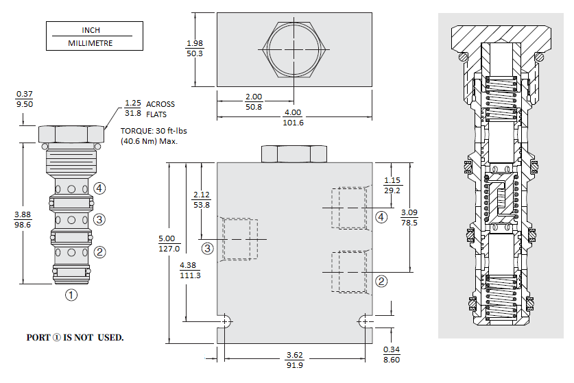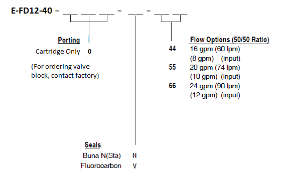 In the dividing mode, the E-FD12-40 will divert input flow from port 3 to ports 2 and 4, based on the ratio specified, regardless of operating pressure. The cartridge will combine input flows from ports 2 and 4.