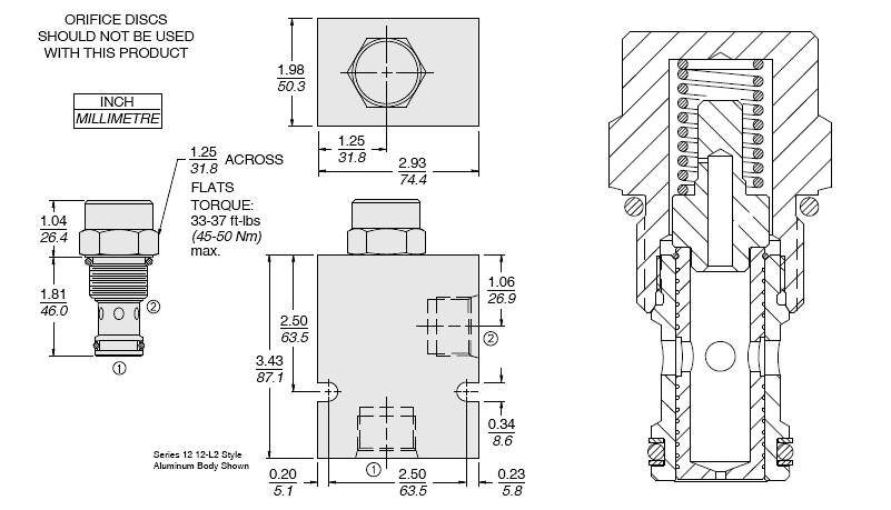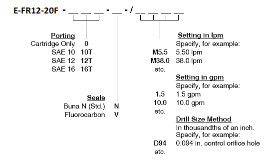 The E-FR12-20F is a screw-in, cartridge style, fixed orifice, pressure compensated, hydraulic flow regulator valve (restrictive type).