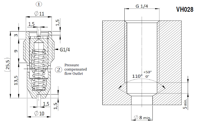 The flow rate of this valve in the 1 to 2 flow path is largely independent of the system pressure and is determined by the dimension of a calibrated orifice. The valve can not be adjusted for variable flow output. Free flow in the 2 to 1 path is allowed and not pressure compensated.